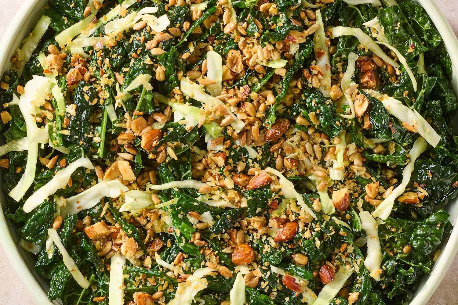 Привлекательность этого салата заключается в контрасте текстур и сбалансированных вкусах. Капуста кале хорошо удерживает форму в заправке, в отличие от более мягких салатов, что делает её более существенным вариантом. Добавление тертой капусты добавляет дополнительный хруст, а домашняя посыпка из поджаренных миндальных орехов, панко и семян подсолнечника дарит пикантную глубину вкуса, которая улучшает всё блюдо.